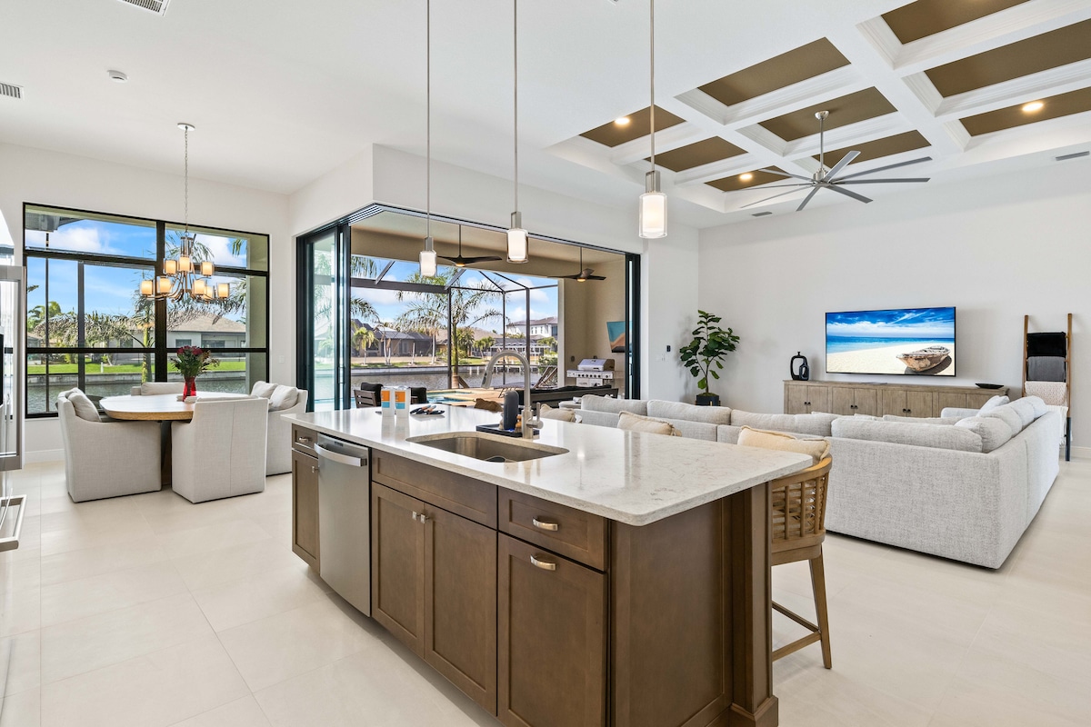 케이프 코럴에서 최고의 수변 거리 중 하나! 해변까지 도보로 가까운 거리에 있습니다. 2,500평방 피트 이상의 이 숙소는 모든 주요 거실 공간과 마스터 스위트에서 멋진 일몰과 남서부 해안 전망을 감상할 수 있습니다. LED 컬러 조명이 있는 온수 수영장, 스파, 수영장 욕조, 완비된 세탁 시설, 베란다, 벽난로, 와이파이, 모든 침실에 TV, 전용 선착장. RPM 렌탈 시 리프트에 있는 보트 대여. 자전거 5대, 해변 왜건, 쿨러가 있는 대형 2차 차고.