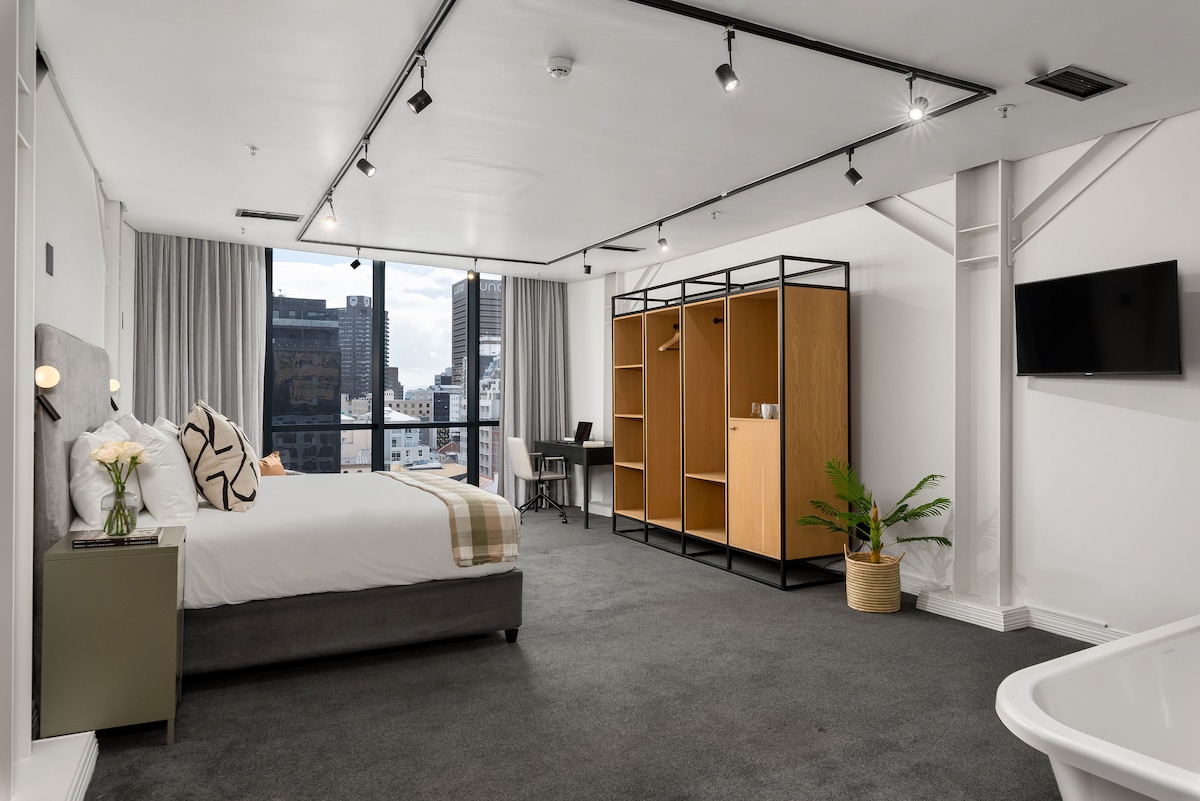 Stay near everything you want to visit. Indulge in luxury, featuring a spacious layout with a king-size bed, open en-suite bathroom with a freestanding bath and double vanity, desk, smart TV, and a tea/coffee station. Relax amidst calming decor, while floor-to-ceiling windows offer expansive views of the cityscape.