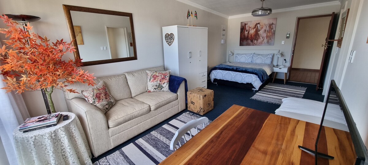 Compact flatlet with private entrance and outdoor dining space as well as secure parking behind a gate. This space boasts a modern bed-desk for business and recreational screen-time or breakfast in bed. This suburban living space allows for close access to malls and main roads but also for beautiful strolls in the nearby vineyard. Newly renovated with all the essentials for anyone including traveling persons/couples, businessman/businesswoman and anyone in between.