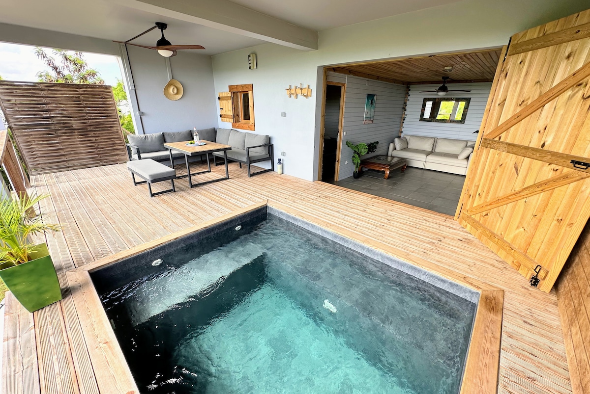 TI'KAZ Cannelle는 크리올 스타일의 방갈로로 나무와 열대 색상으로 되어 있으며 아이를 동반한 커플을 수용할 수 있습니다. 넓은 나무 테라스에는 식사 공간, 편안한 거실, 해먹이 있으며 전용 수영장과 바나나, 파파야, 히비스커스 등 독특한 식물이 가득한 정원이 내려다 보입니다. 휴식과 환상적인 경치가 보장됩니다!