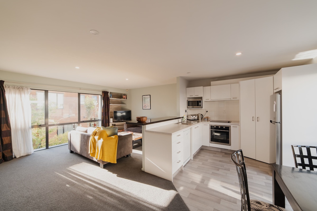 New central city apartment, 5-10min walk to all central Christchurch locations including the Riverside Market, the Terrace bars and restaurants, Cathedral Square and city retail precinct. Sunny outdoor courtyard opening onto a park. Private off street carpark, on bus route and 5 min walk to central bus exchange. Unlimited free wifi, smart tv, Netflix.