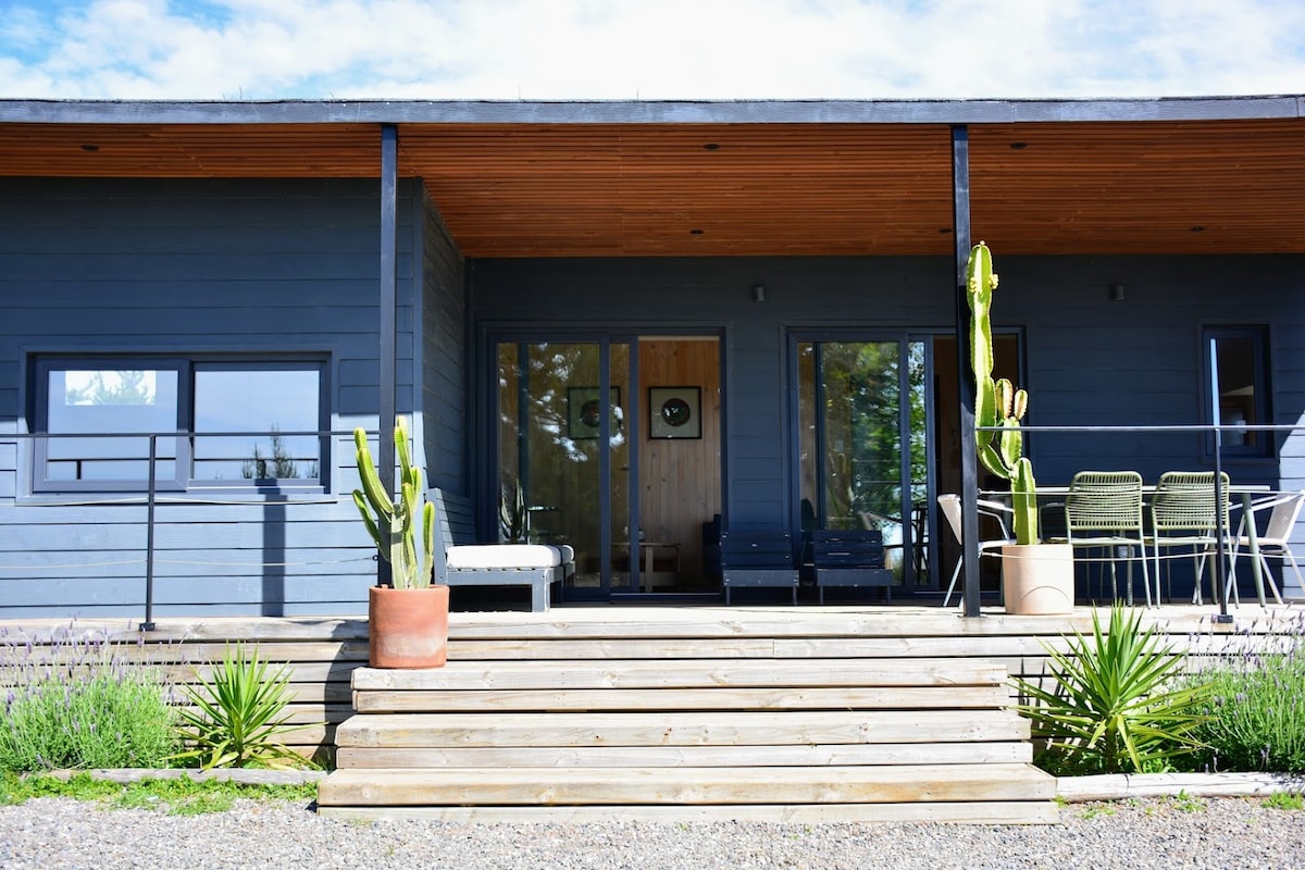 Casa Maqui Pichilemu: Ecological Refuge with Spectacular Views. Between Pichilemu and Cahuil, in an ecological reserve, with sea views and magical sunsets. Design: Fine finishes, double-pane windows, spacious living room, and open kitchen. Heating: Pellet stove. Outdoor: Terrace with table, hammock, grill, and fire pit. Capacity: For 6 people. Privacy: Two independent houses. Nature: Beautiful trail in the reserve. Car recommended for arrival.