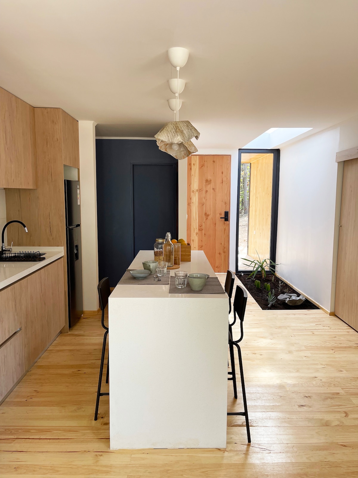 New house in front of the beach and surf break, with stunning ocean views. Located in the heart of Punta de Lobos, inside a private gated community. Modern, bright, and well-heated, with a garden, patio, BBQ area, and outdoor hot shower. Fully equipped with Starlink, open-concept kitchen, TV, and desks for remote work. Ideal for families seeking comfort and the chance to enjoy the beach, surf, and sunsets—no need to get in the car.