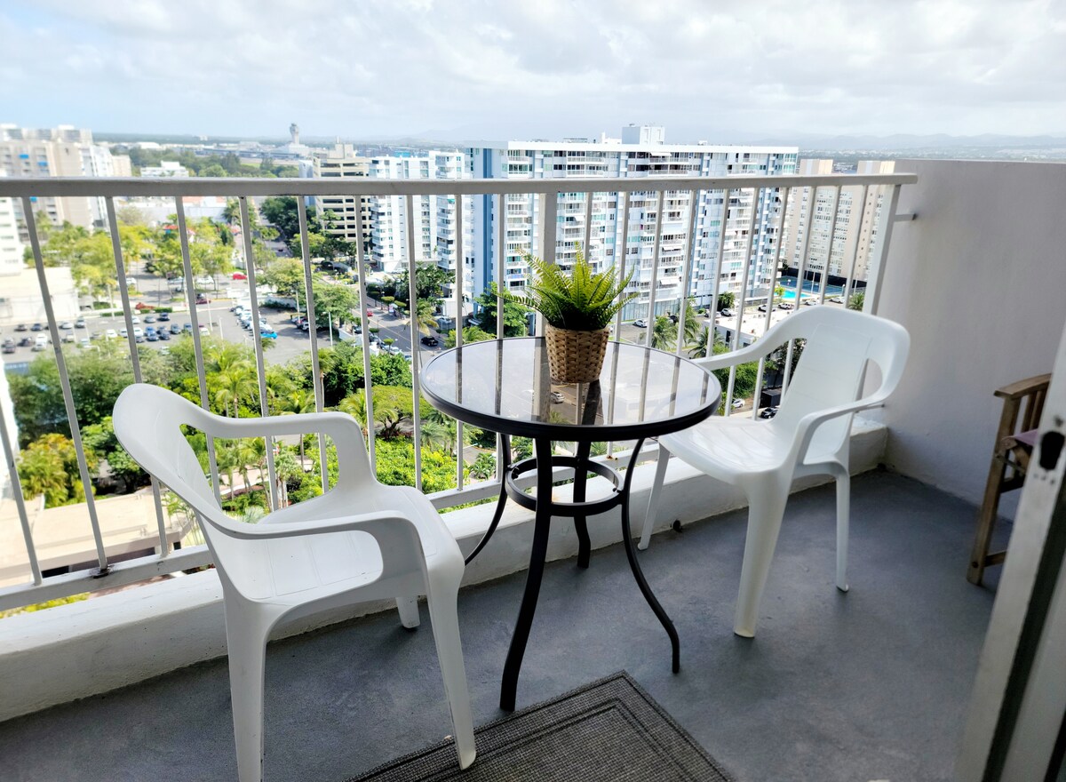 Enjoy million-dollar ocean views from this 16th-floor studio, just 5 minutes from SJU Airport ✈️ and steps from the beach 🏝️. Fully equipped for your stay with a king bed, pull-out sofa, and kitchen 👩🍳. Self check-in anytime after 3 PM, one free parking 🅿️ spot, and access to paid laundry 🧺 machines. Free luggage storage 🧳 before check-in/after check-out. A 24/7 supermarket is 5 minutes away. **NOTE: Pool is closed** Book your Puerto Rico 🇵🇷 escape today! ☺️