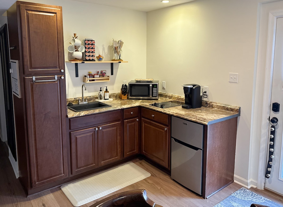Cozy, comfortable, and quiet walk-out basement apartment with convenient access to downtown Fredericksburg, local shopping, and VRE to DC. There is a private back entrance. Has a full kitchen with gas range/oven, microwave, dishwasher, full size fridge, Keurig, pots and pans, silverware, and dishes available. Shared washer/dryer and outdoor patio space are available as well. The bedroom boasts comfortable queen size bed, dresser, and closet.