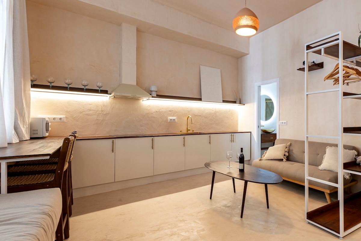 알마 팀은 바르셀로나에서 가장 유명한 거리인 라스 람블라스에서 떨어진 곳에 위치한 19세기 건물 내에 있는 독특한 아파트 6개를 새로 단장했습니다. 에어리 보헤미안 스튜디오에서는 이비자의 차분한 분위기에 푹 빠져 편안한 분위기를 즐길 수 있습니다. 아름다운 화분을 매달아 놓은 고리버들 펜던트 조명 아래의 아카풀코 의자에 앉아 휴식을 취해보세요. 햇살 가득한 발코니 문을 열어 아래의 거리를 내려다보며 아늑한 저녁 식사를 즐겨보세요. 그리고 이보다 더 중심부에 위치한 플랫을 찾을 수 없을 것입니다!