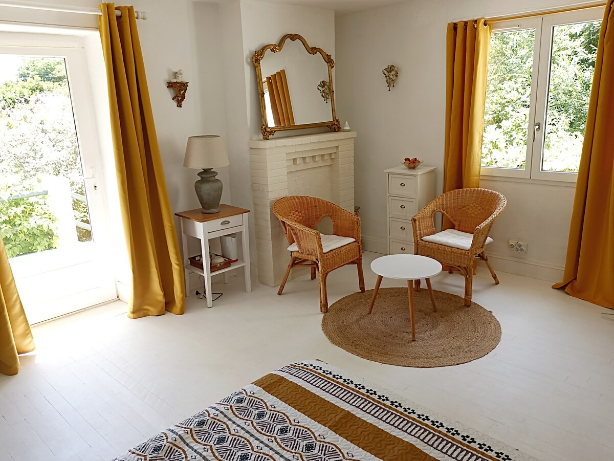 Grande chambre, avec un lit pour 2 personnes, grands placards, située au 1er étage d'une maison individuelle. (Pas d'entrée indépendante).Ventilateur au plafond (pas de clim). Salle de douche privative. Linge de lit et de toilette fournis + sèche-cheveux. Environnement très calme, entouré de verdure. Commerces accessibles à 5 minutes à pieds. Petit déjeuner en option (6€/pers). Me le signaler avant votre venue. Bouilloire et cafetière. Café et thés à disposition dans la chambre. Micro-ondes.