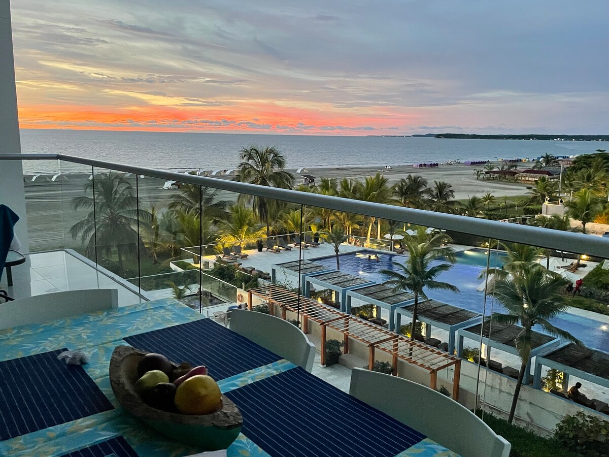 Moderno y cómodo apartamento sobre la más reservada y exclusiva playa de Cartagena. Toma tu bebida favorita mientras ves ponerse el sol tras las olas en el balcón. Ideal para parejas y parejas con niños que quieran relajarse lejos del ruido, mientras tienen todo lo que Cartagena ofrece a solo 20 minutos de distancia.