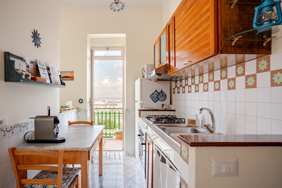 나폴리 도심의 매력적인 아파트, 페트라이오 지역(고대 계단), 조용한 곳에 위치한 최상층, 엘리베이터 없음, 나폴리만(베수비오 화산, 카프리 섬, 포실리포 언덕)의 멋진 바다 전망 테라스. 넓고 밝은 거실 공간에는 소파와 마졸리카 타일로 장식된 주방, 식탁 및 테라스 테이블이 있어 만 바다를 감상할 수 있습니다. 위층에는 전망이 좋은 더블 룸, 욕실, 서재/휴식 공간이 있습니다.