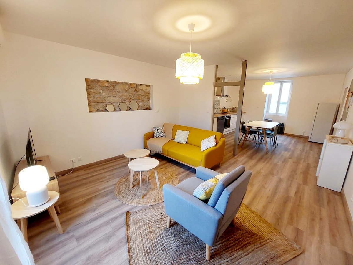 Découvrez le Canopé, un bel appartement de 65m2, soigneusement aménagé et décoré. 🌿 Profitez d'un séjour en groupe convivial tout en respectant l'intimité de chacun. 😊 📍Central. 2ème étage d'une résidence très calme. 🚗 Stationnez facilement : Parking payant devant le logement. (App Flowbird) 🛏️ L'ensemble du linge de maison est fournis. ☕️ Articles d'accueil. Savon, gel douche/shampoing, thé, café, sucre, condiments... 🛜 Wifi fibre gratuit, Smart TV. ❄️ Climatisé.