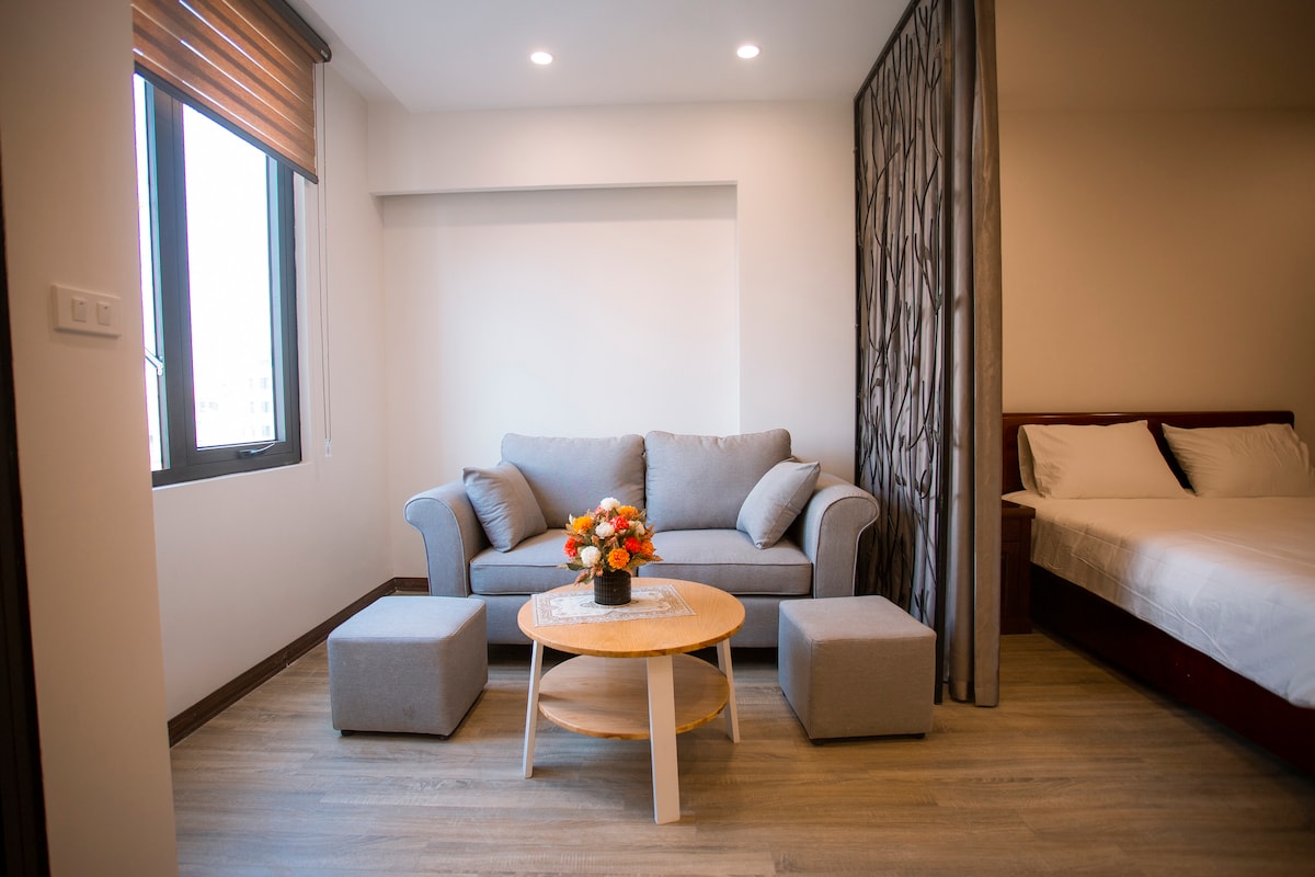 저희 서비스 아파트는 가구가 완비되어 있고 넓고 아늑하며 창문이 있으며 매우 깨끗합니다. 도시와 호수의 멋진 전망을 감상할 수 있는 커피숍과 옥상 정원이 있습니다. 위치는 이상적이며, 강남타워, 더 가든 몰, 빈마트에서 도보로 5분 거리에 있으며, 주변에 베트남 및 한국 음식점이 많습니다. 버스, 택시, 그랩 바이크를 쉽게 이용할 수 있습니다. 3일마다 1회 객실 서비스와 세탁이 무료로 제공됩니다. 인터넷 와이파이, 넷플릭스, CATV는 무료입니다.