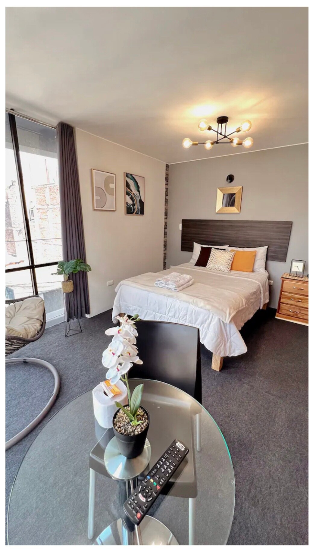 Esta habitación moderna y sofisticada mide 15 mt2, está equipada con una cama Queen con box spring, alfombra, TV de pantalla plana de 42 pulgadas, frigobar, caja fuerte, secador de cabello (a pedido), teléfono y baño privado con artículos de aseo gratuitos. Se proporcionan edredones de plumas y ropa de cama de la más fina línea hotelera. En las áreas públicas contamos con recepción 24 horas, lavadora, cocina, comedor y terraza. NO INCLUYE DESAYUNO (costo adicional)