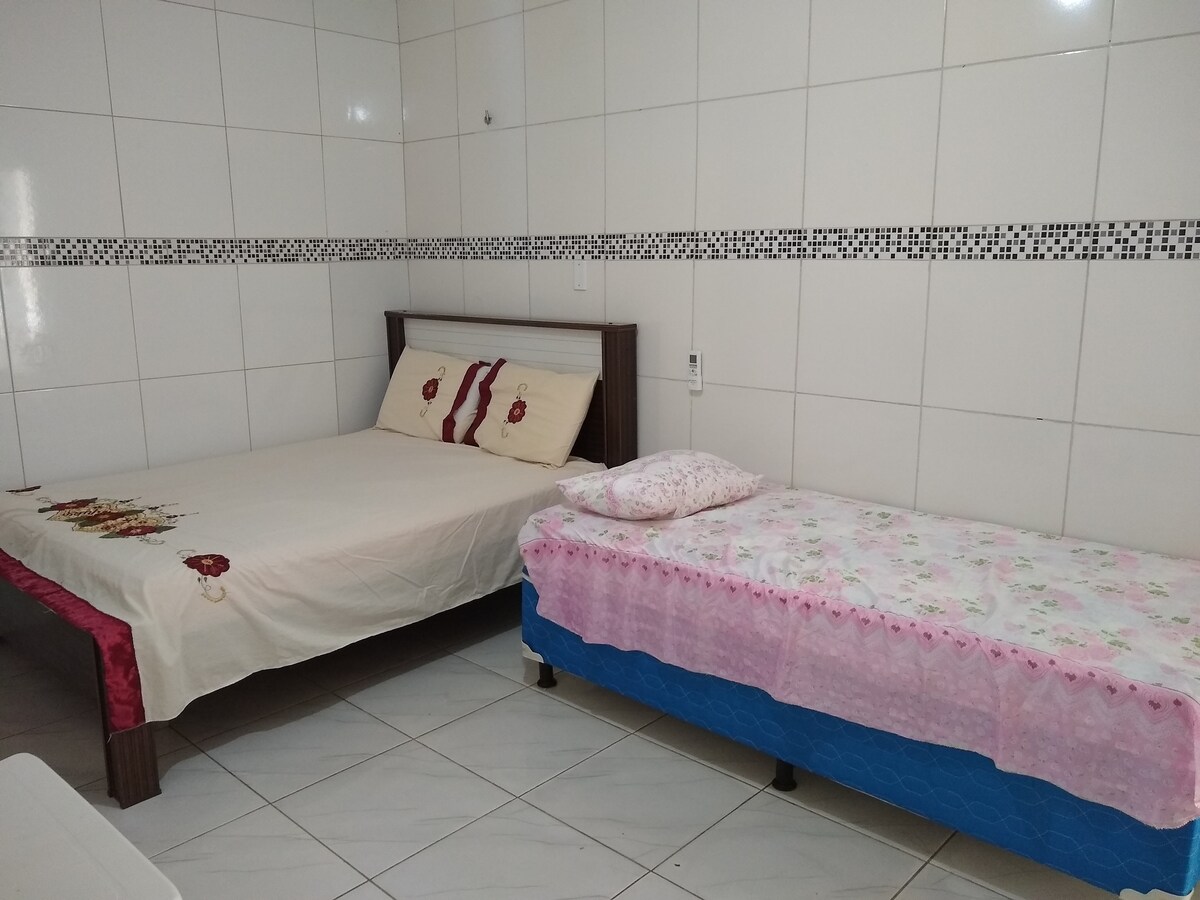 Ideal para viagens rápidas. Ótimo lugar com espaço para cozinhar e descansar. Perto de supermercado e churrascaria. Local silencioso e pouco movimentado. Ar condicionado Geladeira 1 cama casal + 1 colchão casal Fogão 4 bocas Banheiro Sala de estar