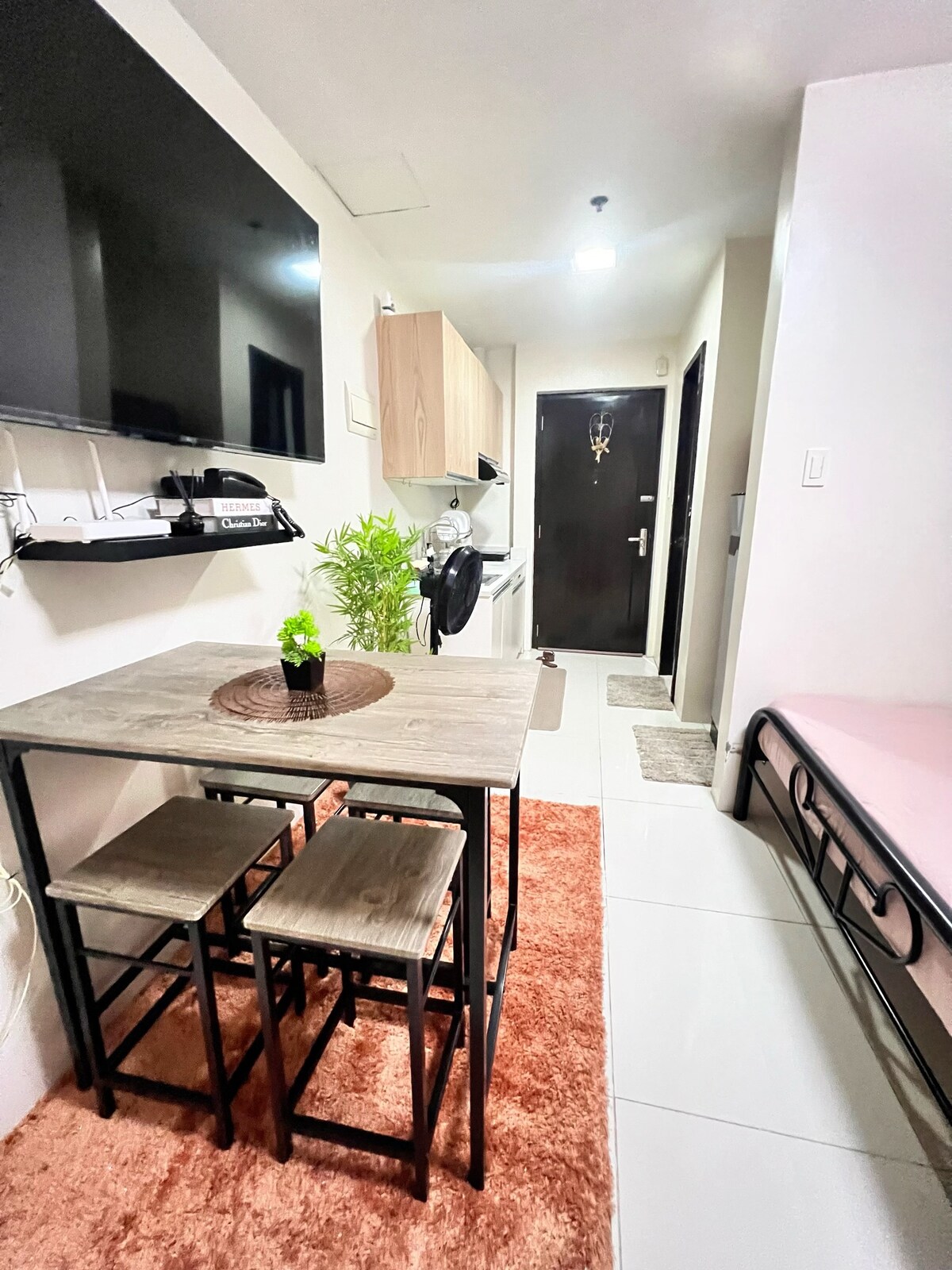 - 넓은 침실 1개 유닛으로 최대 7명까지 편안하게 수용할 수 있습니다. - 침실에는 더블 사이즈 침대와 싱글 사이즈 매트리스, 거실에는 더블 사이즈 소파 베드 2개가 있습니다. - 디즈니+, 아마존 프라임, 맥스, 유튜브 등을 이용할 수 있는 42인치 스마트 TV - 초고속 광섬유 인터넷 연결 최대 350++Mbps 속도 - 전용 워크스테이션 - 수영장 3개 - 조리 도구가 구비된 주방 - 식탁 - 아얄라 몰 센트럴 블록, 레스토랑, 편의점, 커피숍, 바 등까지 도보 거리