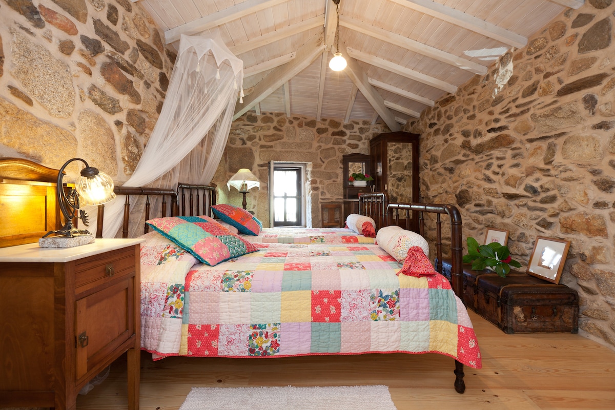 Trata-se de casa Moinho MN,têm cama de casal,cama individual e sofá cambalhota extra para filhos, permite o alojamento gratuito de 2 filhos até 12 anos, casa de banho com coluna de jacuzzi.Possui uma cozinha equipada e exclusiva Espaço rodeado por praia fluvial privativa, com quedas de agua e lagoas, ideal para passeios de barco.Grande e lindo bosque, local muito sossegado, no meio da natureza. Bom para casais, aventuras individuais,famílias(com crianças)piscina.Enotecaoferta prova vinhos quinta