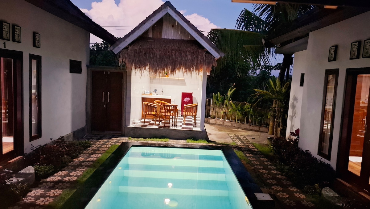 Bungalow traditionnel balinais tout en bois, décoré avec goût. La chambre de 24 m2 possède un lit 180 x 200 très confortable, un bureau et une grande armoire. La salle de bains attenante comprend une grande douche à l'italienne avec eau chaude, un WC et un grand lavabo avec miroir. Le petit déjeuner inclus, vous sera servi chaque matin, entre 8h et 11h selon vos souhaits. Vous aurez le choix parmi du pain, des pancakes vegan, des oeufs, ou un smoothie bowl, le tout fait maison.
