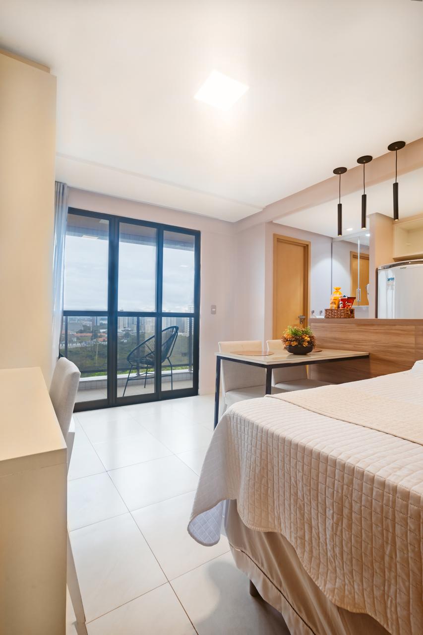 Studio model apartment, located on Avenida dos Holandeses, in the Calhau neighborhood. With 30 m², it features a balcony with a city view. The space combines bedroom and living room with an open-plan kitchen and private bathroom. The apartment accommodates up to three people and has a digital lock on the door. The condominium offers a complete leisure area, remote concierge, 24-hour reception with doorman, and a parking space. Located near beaches, supermarkets, and restaurants.