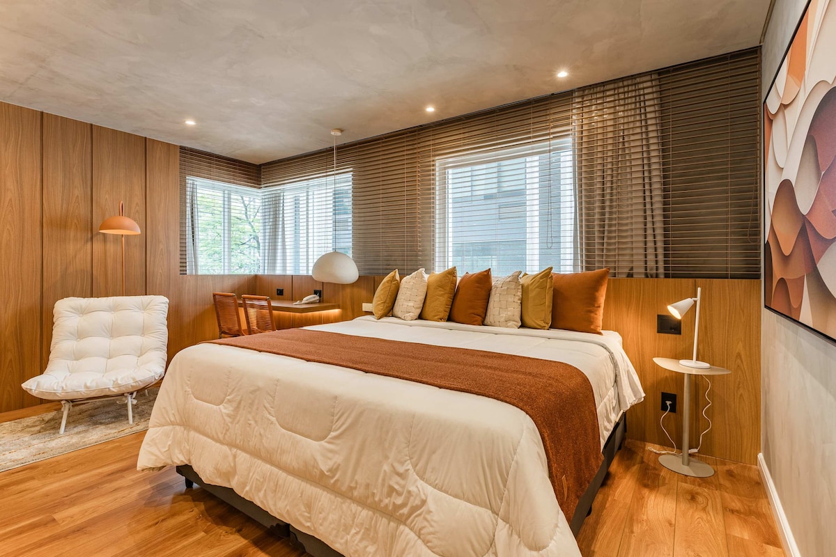 새로운 듀플렉스 로프트 | 놀라운 전망 | 16층 | VN 멜로 알베스 특별한 트립 > 탁 트인 전망 > 퀸사이즈 침대 > 초고속 와이파이 > 냉난방 에어컨 > 인터넷이 연결된 스마트 TV > 16층 > 발코니 > 암막커튼 > 주차 공간 훌륭한 지역 > Rua Melo Alves 268 prox Oscar Freire > 지하철에서 300m 완공된 콘도미니엄 > 세탁기 및 건조기가 있는 세탁소 > 풀 헬스장 > 코워킹 > 연중무휴 대면 컨시어지