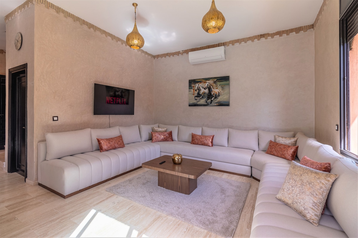 마라케시 시내에서 20분 거리에 있는 평화로운 2베드룸 숙소에서 도시의 번잡함을 벗어날 수 있습니다. 자연과 평온을 사랑하는 이들에게 완벽한 이 세련된 휴양지는 지상 수영장, 퍼걸러, 아늑한 휴식 공간이 있는 전용 옥상을 제공합니다. 아름다운 일몰, 완비된 주방, 와이파이, 현대적인 욕실을 즐기세요. 커플, 소규모 가족 또는 활동적인 지역에서 멀리 떨어져 있지 않은 곳에서 평온을 찾는 원격 근무자에게 이상적입니다. 오아시스가 기다리고 있습니다!