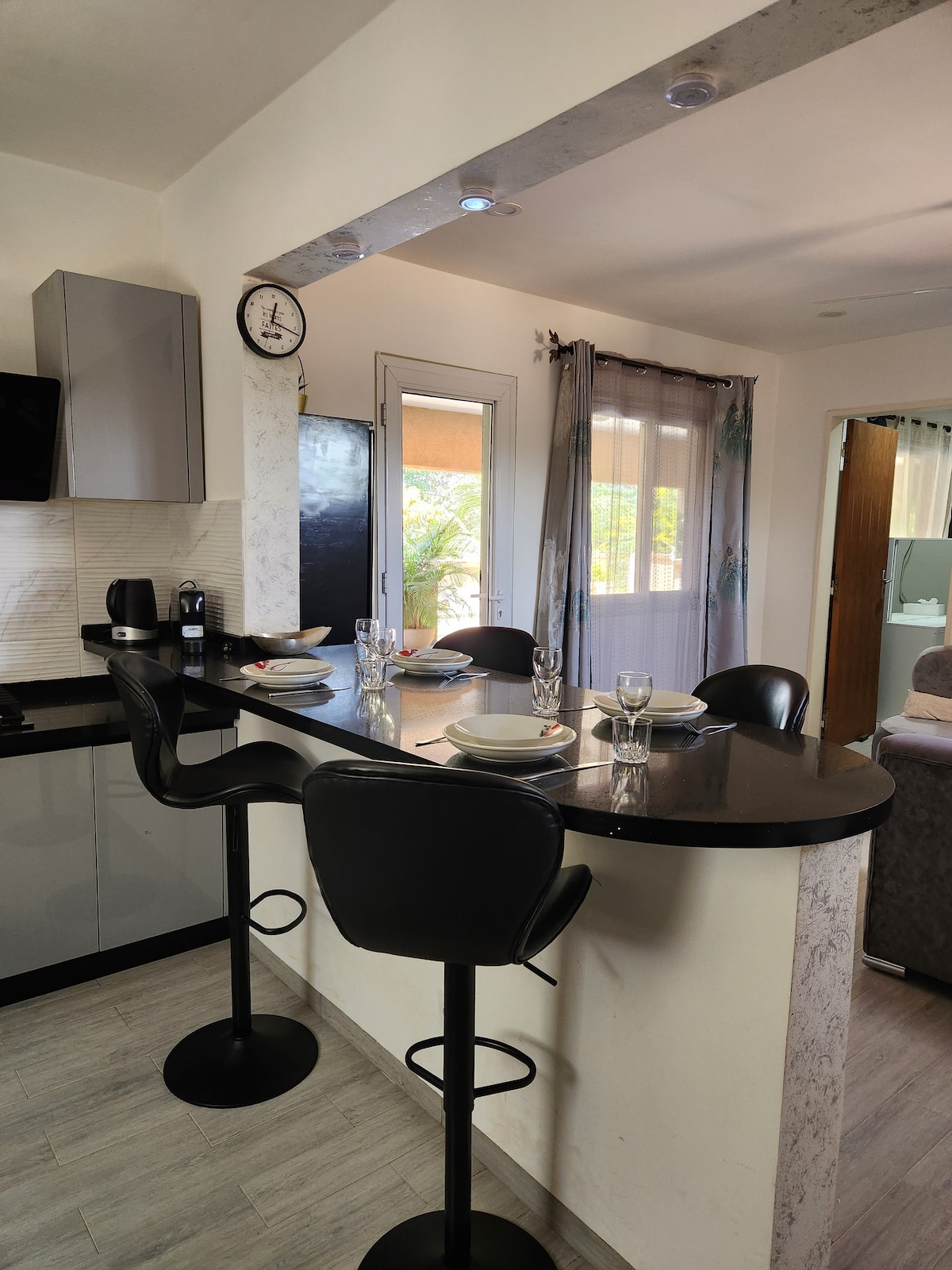Logement de Haute Standing composé d'une chambres, salon et cuisine ouvert à l'américaine. Le logement est entièrement équipé avec toutes les commodités (clim, eau chaude, TV, Wifi, micro onde, Mixeur, machine à laver...). Un jardin à l'avant et à l'arrière de la maison permet de se détendre en toute tranquillité. Possibilité de stationner 2 véhicules Le logement est situé à Pissy à 15 min de l'aéroport et du centre ville.