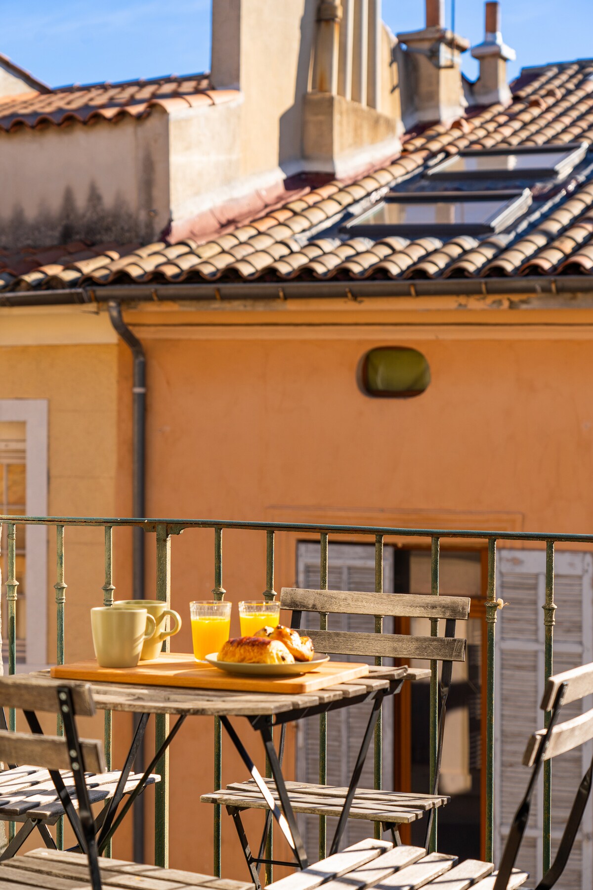Le charme du dernier étage d'un Hôtel Particulier aixois du XVII ème siècle, classé par les Bâtiments de France. Vous donnerez directement sur la place des Prêcheurs nouvellement rénovée et son marché provençal. En plein centre historique piéton d'Aix, face au palais de justice, vous serez à moins de deux minutes du cours Mirabeau.