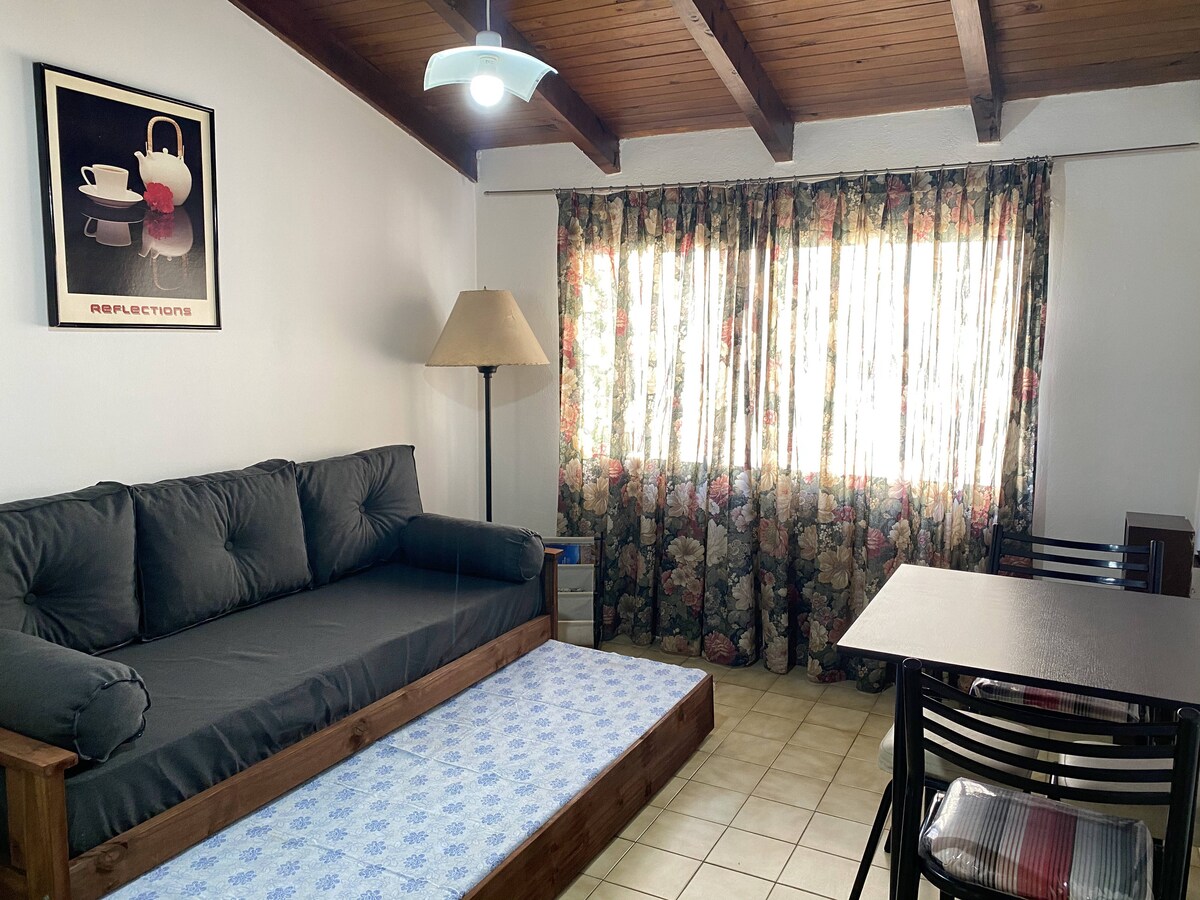 Amplio y luminoso bungalow de 2 ambientes, ideal para parejas, cómodo y acogedor, con excelente ubicación, a pocos metros de centros comerciales, transporte público y a pasos del teleférico Cerro Otto. Cuenta con señal de Wifi, cocina completa equipada con cafetera, pava eléctrica, microondas y heladera con freezer, baño completo con bañadera, espacioso dormitorio con sommier de 2 plazas, smart TV, estacionamiento y jardín para disfrutar, en un espacio tranquilo y familiar.