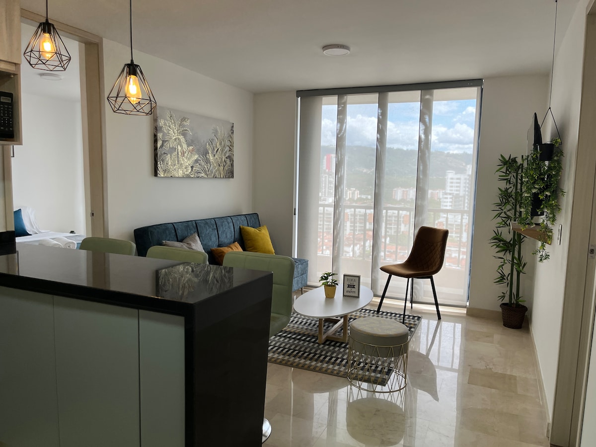 Hermoso y Nuevo apartaestudio con vista donde podrás apreciar encantadores atardeceres. Totalmente amoblado con todo lo que necesitas para tener una excelente estancia; Sala con sofá cama, comedor, balcón grande, Ubicado en conjunto cerrado, tranquilo y seguro. Con excelente zona de restaurantes, supermercados, peluquería y droguerías. Excelente ubicación a pocos minutos de HIC, Foscal, Fosunab, Cardiovascular. Perfecto para profesionales de la salud, pacientes o acompañantes. ¡Siéntete en casa!