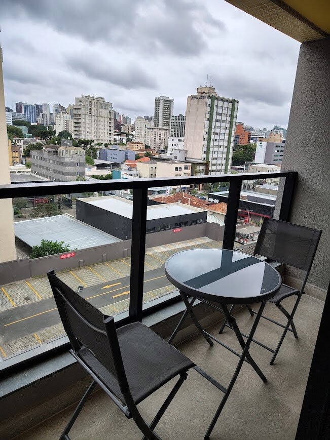 Estúdio novo e completo, para ate 3 pessoas em um dos prédios mais disputados de Curitiba. Em frente ao shopping Curitiba, e próximo a mais 3 shoppings. Totalmente seguro, portaria e segurança 24 hs. Vários restaurantes proximos, Hard Rock, outback . Muito bem equipado ,ar quente frio ,wi-Fi, TV, Cozinha bem equipada, maquina lava e seca no Estúdio. O prédio possui piscina aquecida ,sauna, academia ,brinquedoteca área de descanso na área externa com mesas, bancos, cafeteria dentro do condominio