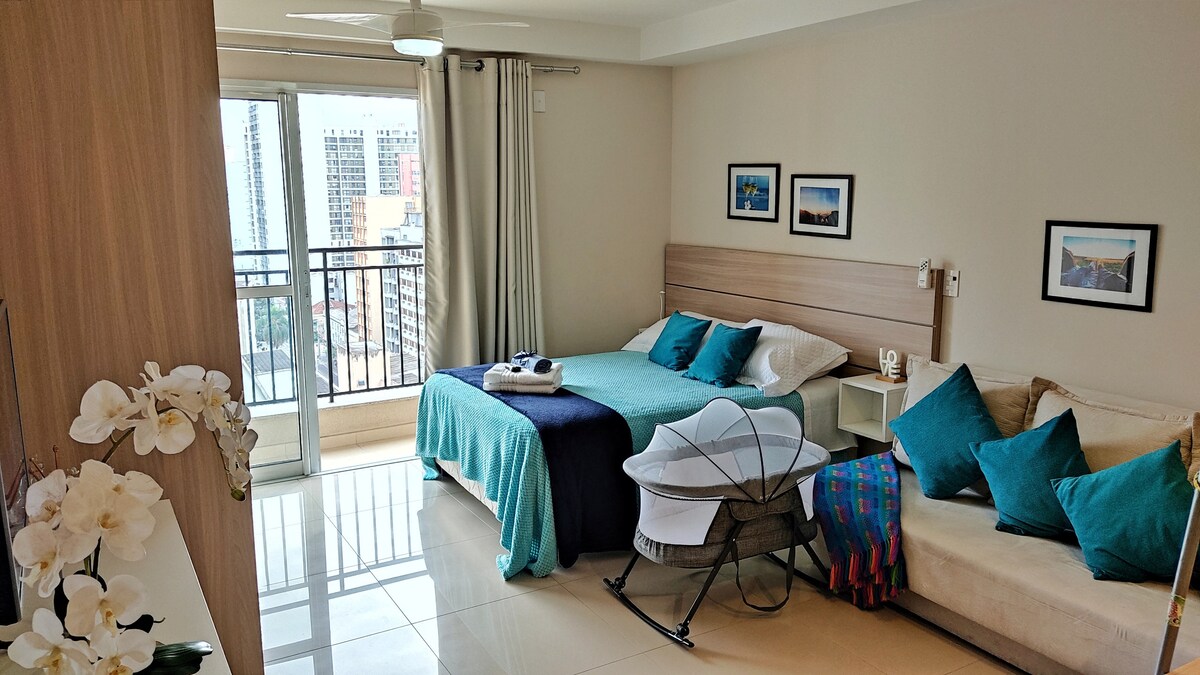 현대적이고 새롭고 아늑한 스튜디오, 완벽한 위치, 특히 밤에 발코니에서 아름다운 전망을 즐길 수 있습니다. 빠른 와이파이, 책상, 55인치 스마트 TV, 퀸사이즈 침대. 에어컨(냉난방). 세탁기와 건조기, 그리고 아름다운 아일랜드 스타일의 주방. 50m2의 세련된 27층, 조용함. 상점, 은행, 쇼핑몰, 식당가 및 병원 근처의 센트로/바텔. 건물 내: 수영장, 헬스장, 게임룸, 사우나, 자쿠지, 24시간 경비원.