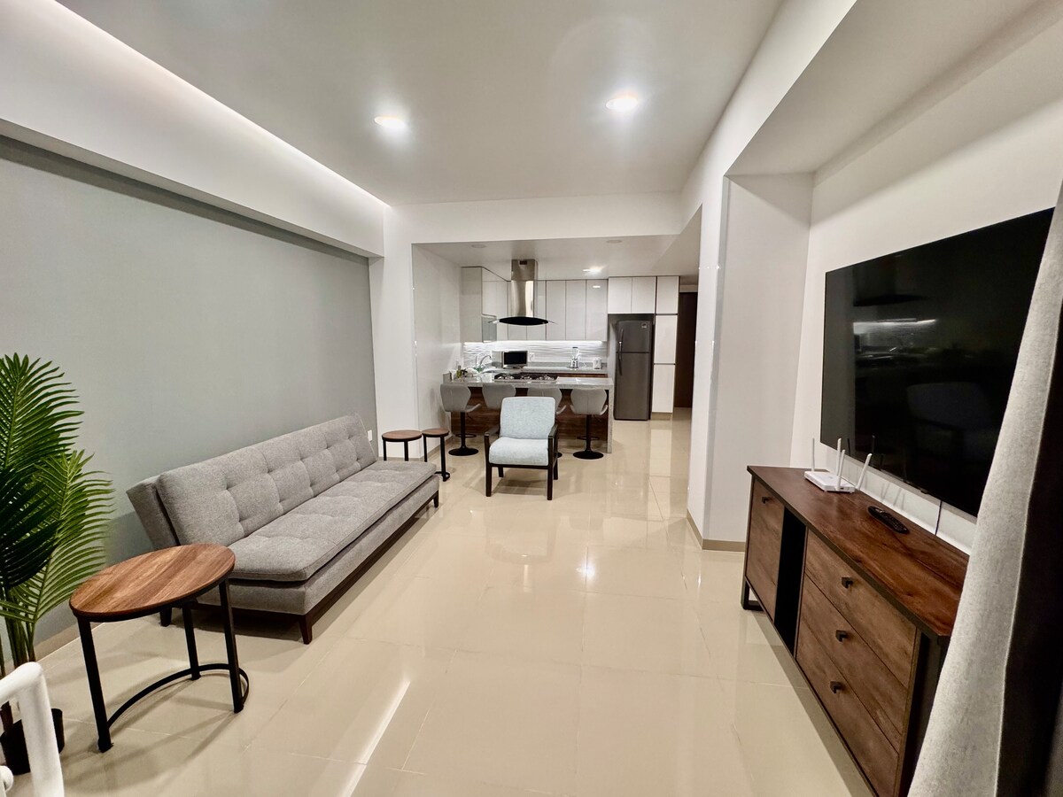 La mejor zona de la ciudad, excelente ubicación. Lugares cercanos: Restaurantes, centros comerciales, Gym y zona bancaria, además de estar a tan solo 10 minutos del centro histórico 2 habitaciones (King/Queen) cada una con baño completo, sofá cama con colchón individual en sala Cocina equipada, sala comedor y acogedora terraza 2 Cajones de auto pequeño en linea Wifi/Netflix/HBO/Star+