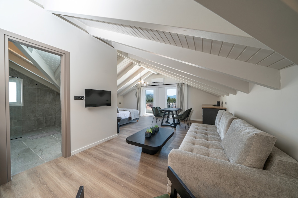 The "Angela Partial Sea View 3" room is located in Kefalonia, just a short walk from the beach. This two-level property features a combined living and sleeping area and one bathroom, accommodating up to 2 guests. Additional amenities include high-speed Wi-Fi (suitable for video calls), a TV, and air conditioning. The room also offers 2 private balconiesโone with partial sea views and the other with beautiful mountain views.