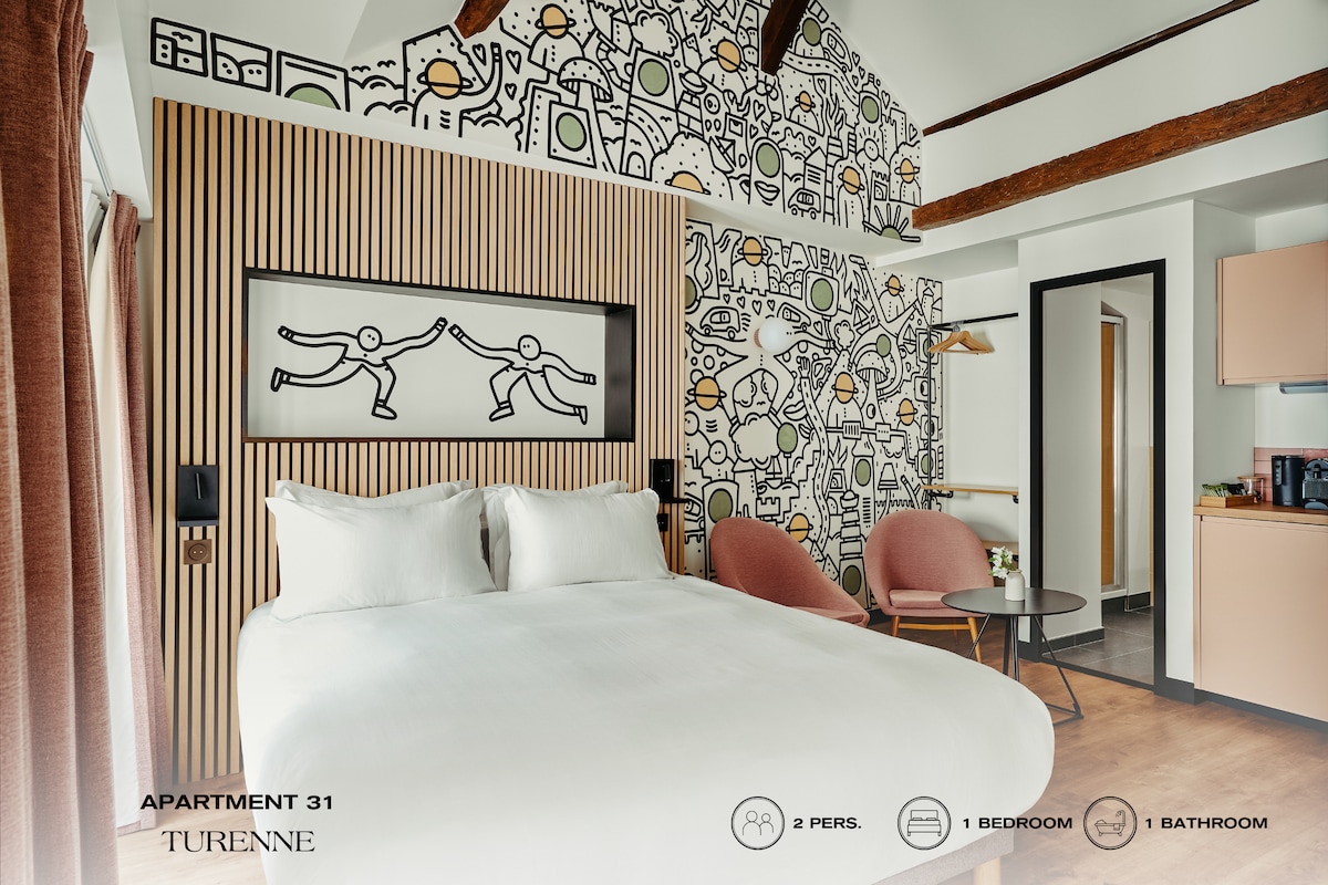 우아함으로 꾸며진 40 ㎡ 의 화려한 에어컨이 설치된 스위트룸으로 꾸며져 있으며, 온수 테라스를 갖추고 있습니다. 이상적으로 파리 한복판에 위치하고 있으며, 가장 아름다운 유적지, 아름다운 상점과 극장에서 가깝습니다. 낭만적인 숙박에 적합합니다.
