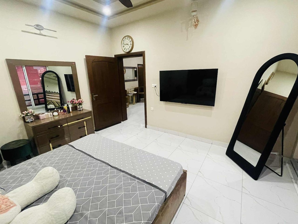 its 5star Ground floor Apartment located at Lush green area on Lower canal road Faisalabad Best for Families, business travelers & groups Its very close to all attractions like kohinoor , D.ground and Lyalpur Galleria. Gated security 24 hrs its on Ground floor with all living facilities 2 Air conditioned rooms with attached baths hot water 1 Living Levish Fully operational kitchen 🌙 Ramzan special wifi+ free Netflix Laundry area with automatic washing machine Food delivery facilities nearby