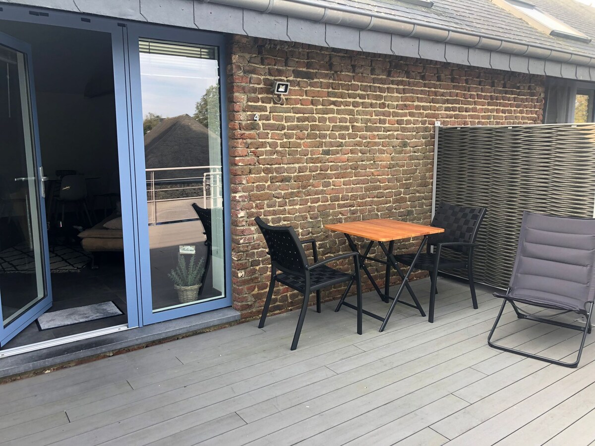 Superbe studio moderne, lumineux et cosy au 1er étage d'une grange complètement rénovée. Au calme, coeur du Centre Ardenne, à 100m des magasins d'alimentation, à 200m d'un centre commercial. Idéal pour un couple. Cuisine équipée, salle de bain séparée avec douche italienne et wc. Grande terrasse de 25m2 avec table 2 pers. et mobilier de jardin (été). Lave-linge en commun avec les autres Studios. Un lit double 160 + un canapé lit (1 adulte ou 2 enfants) dans la même pièce.