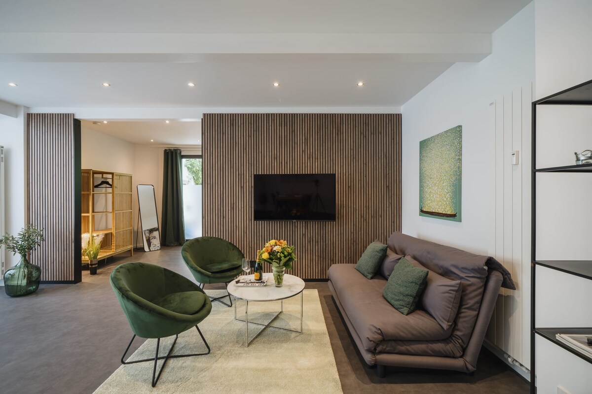 Originally designed and planned as a showroom / meeting room . The idea was to built a place to discuss, meet and represent. Reason for the location which is great to reach anything in this fast growing City of Berlin. The space and atmosphere have a happy synergy and a work / life balance for itself. I love it here - it is usually my office . We have 2 big flat screen TV screens with Amazon Prime, Netflix a sound system with Spotify and an open fire place to calm down.