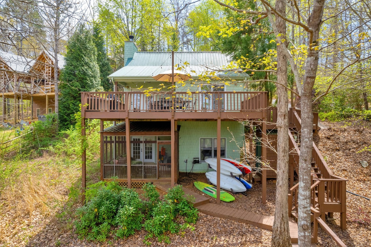 A big tiny house above Lake Rabun that captures both mountains and water. Secluded in the woods at the end of a lane, it is a modern interpretation of an old hunting cabin with boundless room for nature lovers. It is a comfortable home for healthful recreation and the replenishment of the mind and body, and a wonderful place to unplug. Perfect for singles, honeymooners, couples and young families. This is a two story home with the bathroom and bedroom located on the second floor.