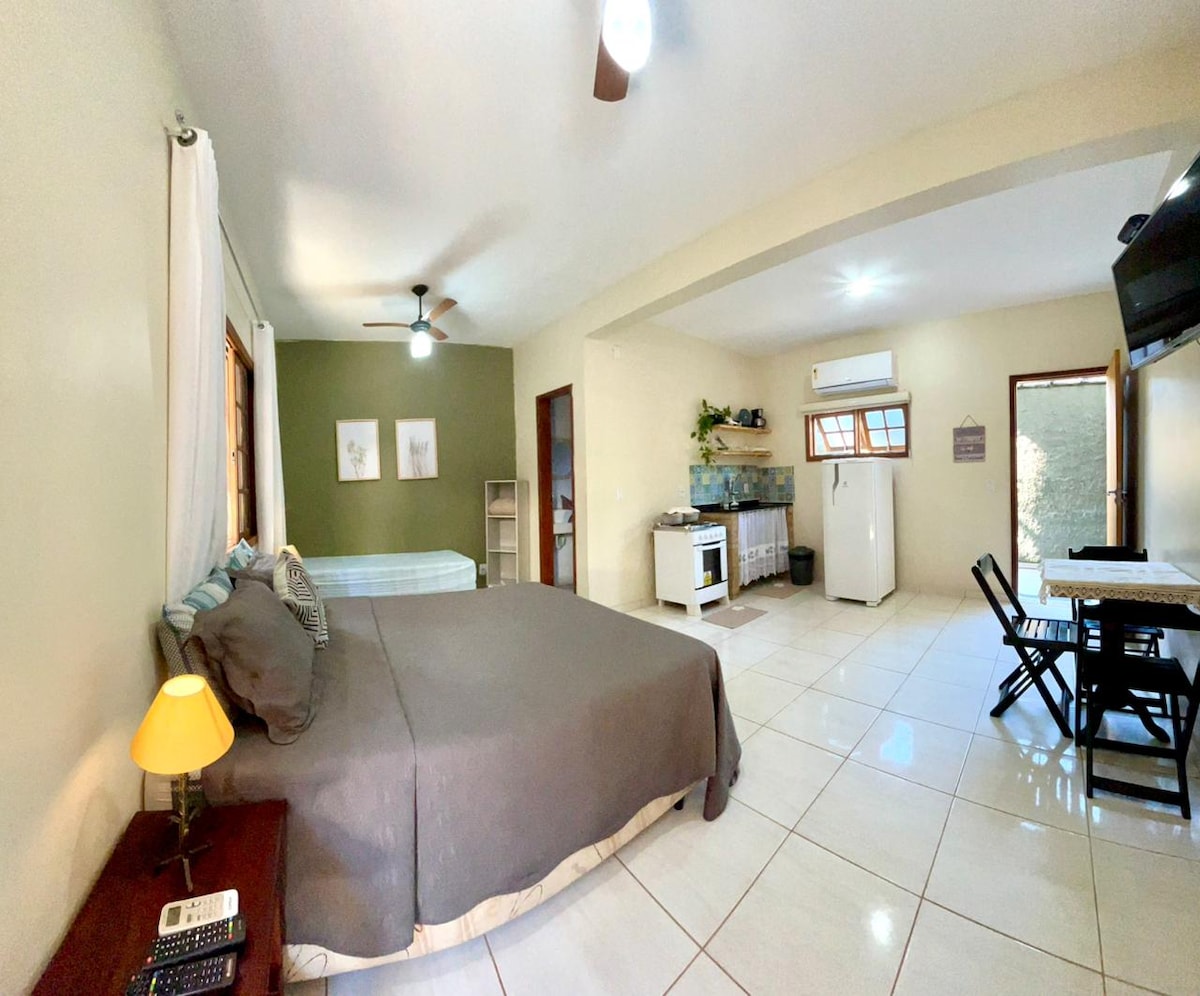Excelente localização, sem morros. Estamos na rua principal, menos de 10 min do centro e a poucos metros da praia, onde estão os melhores restaurantes e bares. Quarto amplo e perfeito para famílias, possui uma cama de casal e 2 camas de solteiro no mezanino. Oferecemos 2 ar condicionados, wifi, frigobar, microondas, sanduicheira, cafeteira, utensílios básicos, pia, roupa de cama e banho, banheiro privativo, varal e área externa. Ambiente tranquilo, confortável. Garantimos fidelidade às fotos.