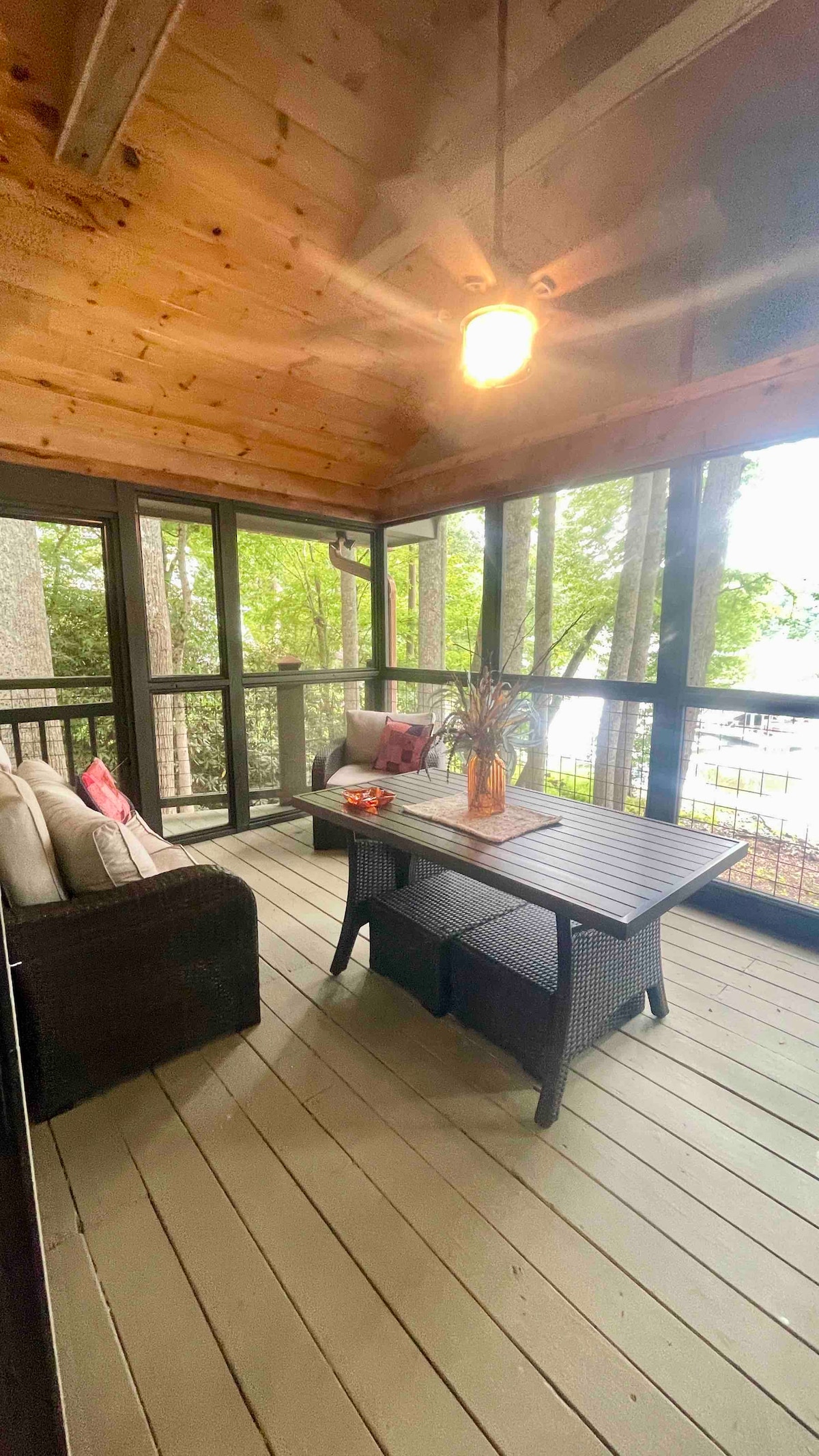 밝고 밝고 관리가 잘 된 2베드룸 2.5욕실이 있으며 마스터는 메인에 있습니다. 아래층에 욕실 1/2개가 있는 추가 수면 공간. 베란다와 데크에 스크린이 설치되어 있습니다. 쌀쌀한 아침을 위한 가스 장작 벽난로. 멋지게 꾸며져 있습니다. 조용한 휴양지를 위한 도로 끝의 프라이버시! 수영과 소풍을 즐길 수 있는 호수 접근 구역. 아름다운 석조 산책로 기능. 중심부에 위치하면서도 조용한 숙소에서 편안한 시간을 보내세요. 휴대폰 수신이 훌륭합니다!(Verizon) 광섬유 인터넷 서비스.