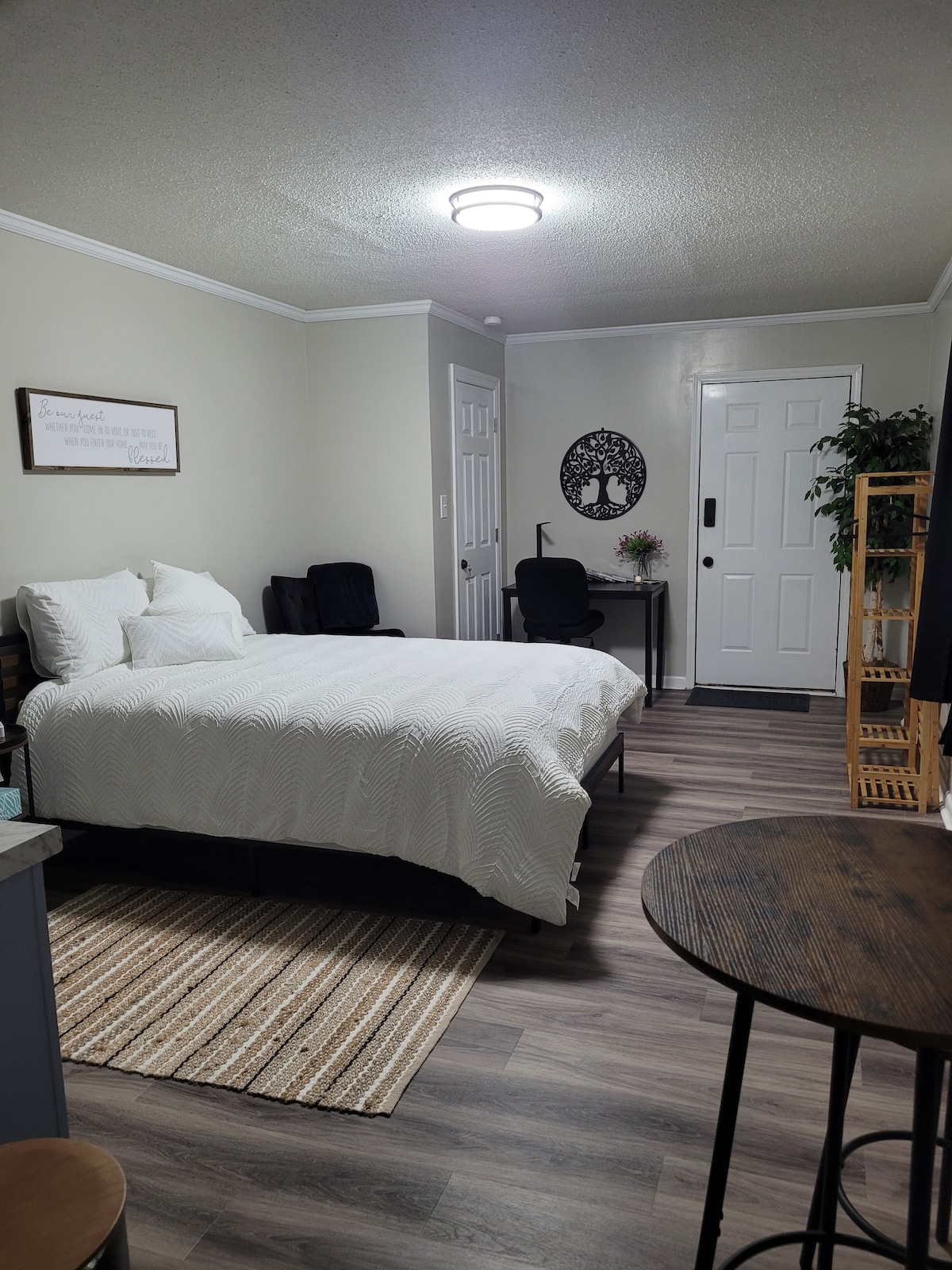 게이트 입구를 통과하여 6에이커 부지로 들어가면 개울 다리 건너편에 게스트하우스가 있습니다. 와이파이, 테슬라 EV 충전기, 좌석 및 그릴이 있는 전면 파티오 공간, 좌석이 있는 지붕이 있는 정자 공간, 작은 개울이 내려다보이는 화덕 및 TV, 반려동물 친화적인 울타리 공간, 게스트하우스 내부는 따뜻하고 매력적이며 개방된 느낌을 주는 많은 창문이 있는 12피트 높이의 거실 공간 천장, 완비된 주방 공간, 적재 가능한 세탁기 및 건조기, 개별 침실 2개 및 욕조 1개를 갖추고 있습니다.