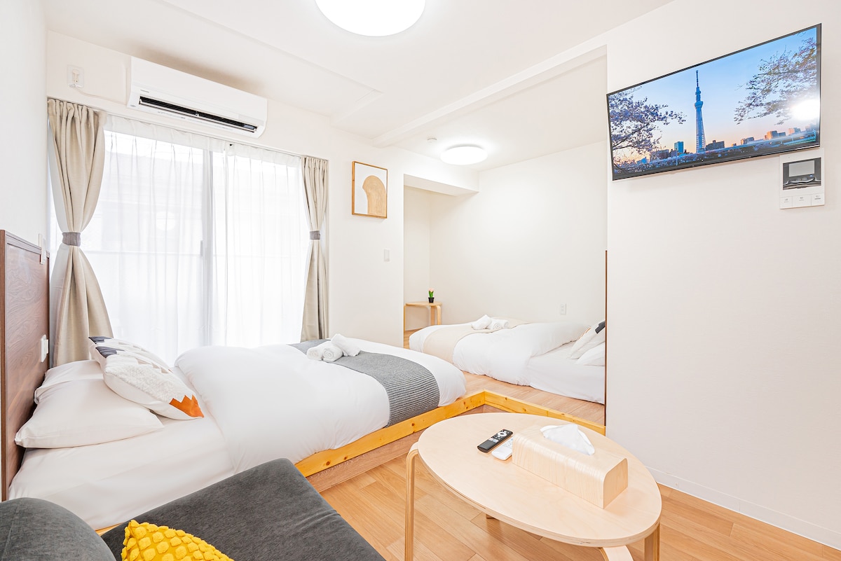 203房间。押上站6分钟,近晴空塔,直达浅草、上野、银座、涩谷、机场。最多3人。行李寄存。