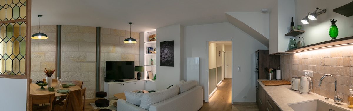 Ce logement, chic et design, se trouve dans le centre historique d'Amboise. Situé à moins de 5 minutes à pied du Château Royal, il fait partie d'une résidence de 16ème siècle avec un jardin à la française. Les restaurants et commerces à 20 m à pied. L’emplacement idéal, avec la place de parking privée se trouve juste devant le logement. Attention ! La Chambre et la salle de bain sont à l’étage, le WC est au rez-de-chaussée. Si c’est un problème de descendre aux WC la nuit, ne réservez pas svp.