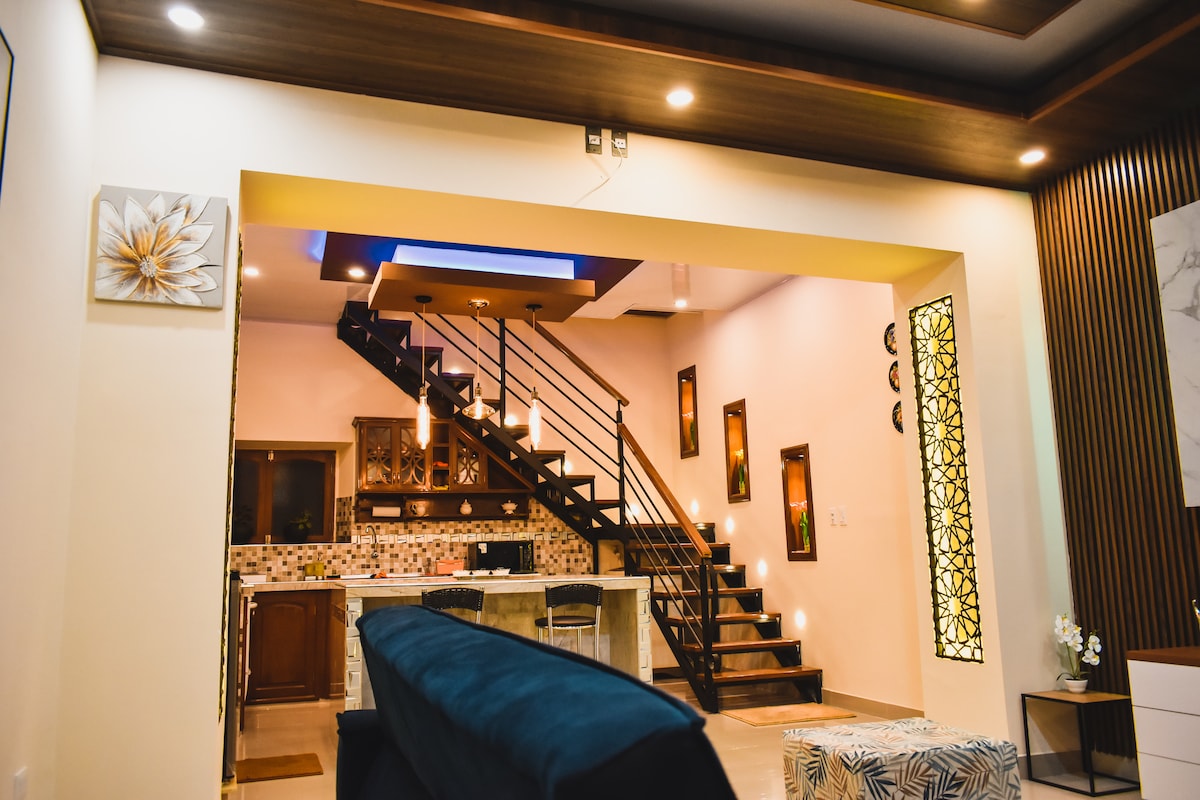 A charming house, designed for couples, families, and small groups. Rest peacefully in its comfortable double bed and two full-size single beds, and enjoy the convenience of two bathrooms and a fully equipped kitchen to prepare your favorite meals. The living room, enhanced with LED strip lighting, creates a modern and relaxing atmosphere—perfect for conversations, movie nights, or enjoying a drink at the end of the day.