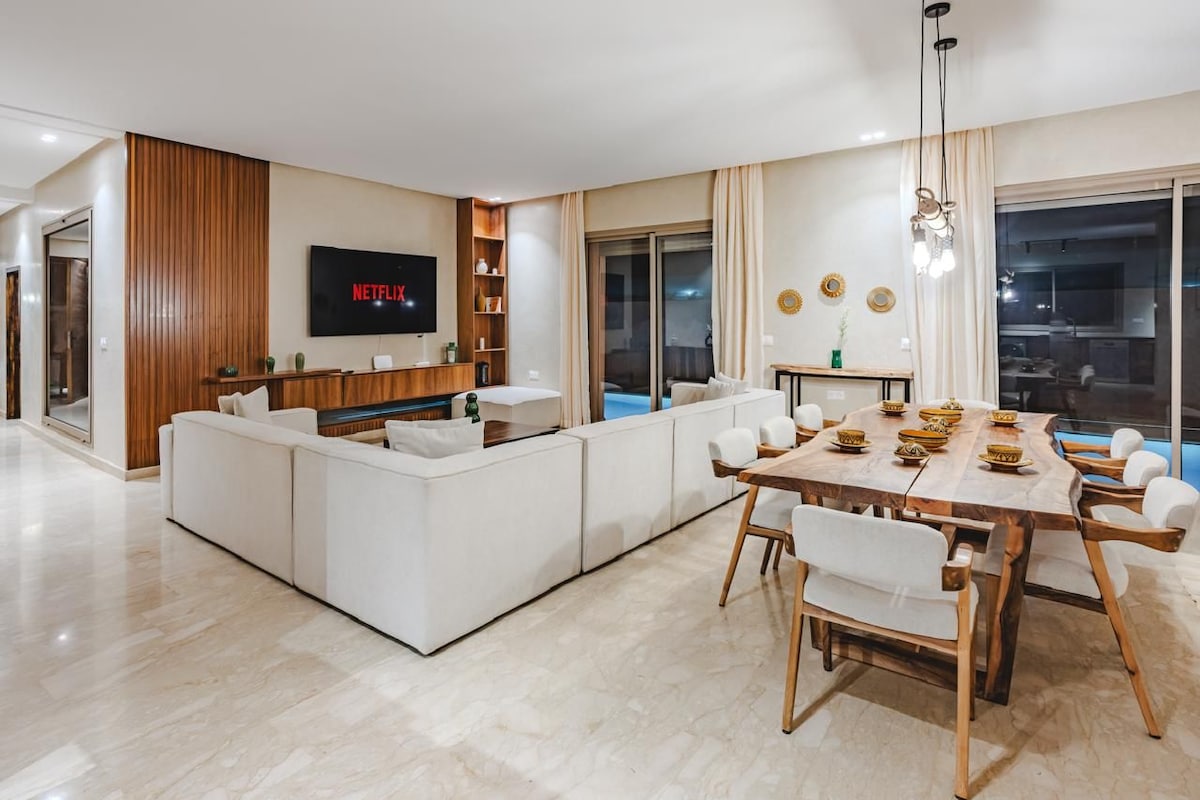 🚘 Car rental available on site! Stay at Villa Rêve d’Atlas, a luxury retreat in Marrakech with a heated private pool (no overlooking), 5 elegant suites, bright living rooms, and a lush garden. Only 25 min from downtown and near golf courses. Private chef, driver & housekeeping available. Perfect for families or groups seeking comfort, privacy & elegance. ⚠️important: Le logement, il accepte pas les couples, marocains non mariés