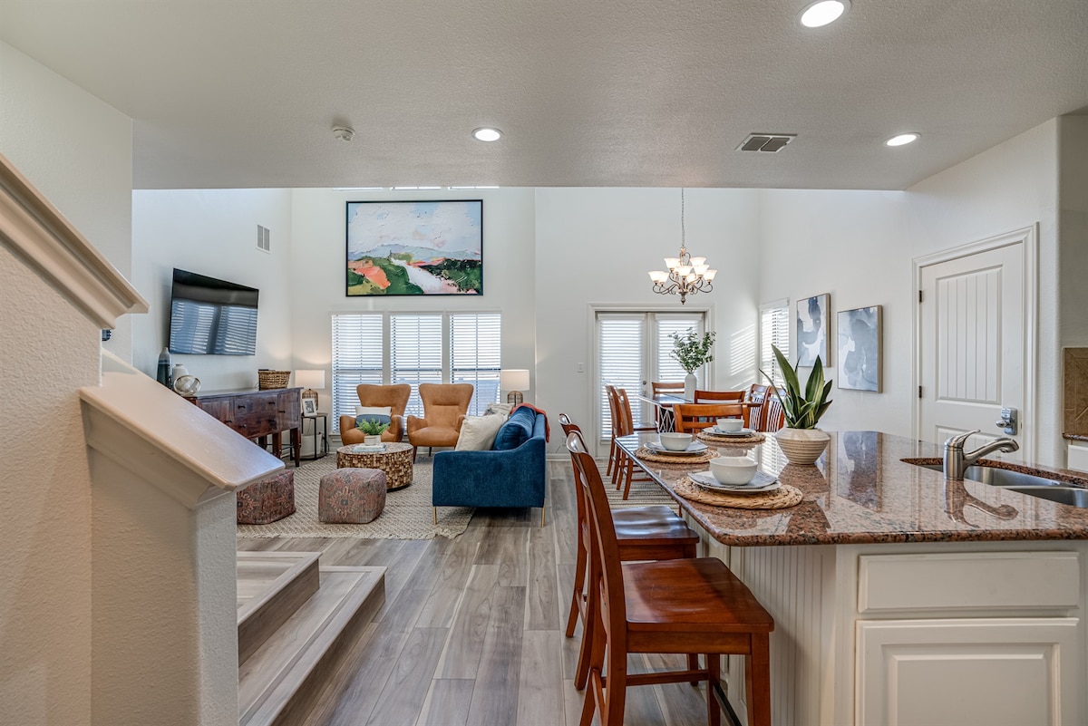 Escape to our stylish, newly renovated Universal City condo! This peaceful retreat comfortably fits families and groups. Features a private hydrotherapy spa hot tub, a fully equipped kitchen, and a dedicated workspace. Enjoy modern comforts and a cozy feel just minutes from Randolph AFB, restaurants, and shopping. Perfect for a relaxing getaway or a productive work-from-home stay.