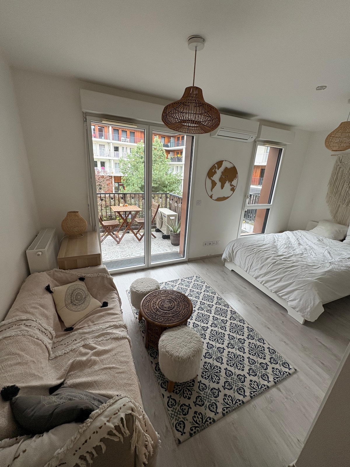 Magnifique appartement, cosy, équipé et très lumineux au cœur des chartrons Emplacement central parfait pour visiter. Parking, transports, commerces, restaurants et parc à proximité. Accès direct à la gare. Deux chambres (lit 160cm) avec salle d’eau privative et dressing sur mesure. Draps et serviettes fournis. Wc indépendant. Cuisine équipée , chauffage et climatisation dans toutes les pièces. Terrasse parfaitement exposée sans vis à vis avec coin repas. Wifi et TV 55' Parking proche