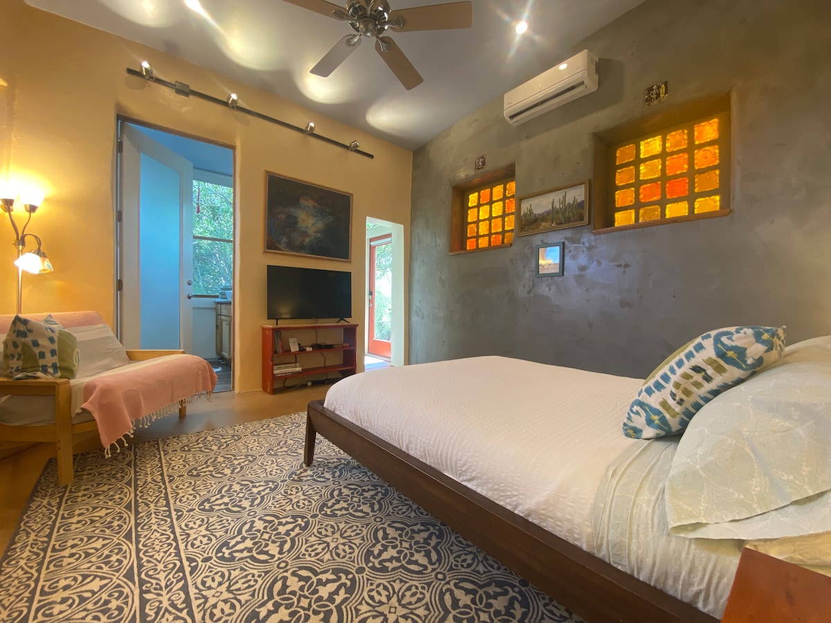 새로 리모델링(2025)된 현대적인 사막 스튜디오로 프라이버시와 편안함이 완벽하게 조화를 이루고 있습니다. 이중 외부 방음문을 통해 본관에 붙어 있지만, 별도의 출입구가 있어 완전한 프라이버시와 평화로운 휴식을 보장합니다. 내부에는 고급스러운 킹사이즈 침대가 있어 휴식과 휴식을 위한 이상적인 공간을 만듭니다. 커다란 창문을 통해 주변 사막의 숨 막히는 전망을 감상할 수 있으며, 스튜디오에 자연 채광이 가득하여 고요하고 차분한 분위기를 자아냅니다.