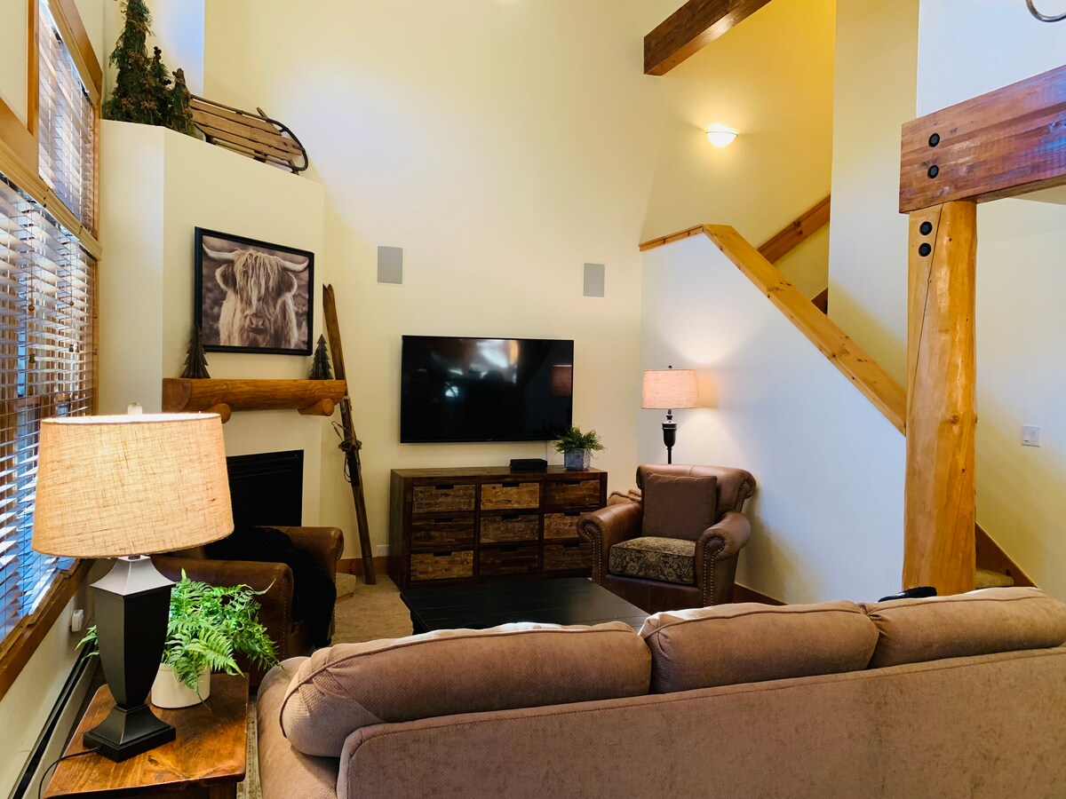 This 1 bedroom 1 bathroom cozy cottage-like condo is perfect for your stay in Keystone. Step into the comfortable living space with high ceilings and great decor. The living room features a gas fireplace, flat screen TV, queen size sleeper sofa, and glass doors opening to the private balcony containing a propane grill. Enjoy cooking delicious meals in the fully equipped kitchen and sit down at the table seating 4 people. The primary bedroom features a queen size bed and flat screen TV.