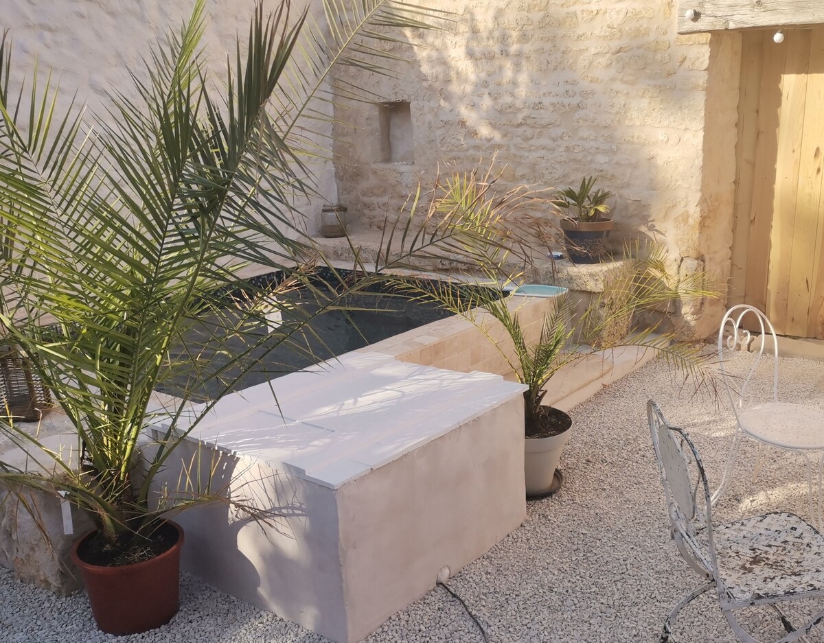 Traditional stone built first floor studio apartment with stylish, contemporary kitchen and bathroom. Outside is an enclosed space for al fresco dining and a splash pool to unwind with a glass of wine. in the privacy of this enclosed space.Situated in a small hamlet a few minutes from the historic market town of Melle and an hour's drive from the stunning city of La Rochelle. Includes a double bed and double sofa bed could have 2 adults, 2 children or 4 people for short stay! Sorry no pets!