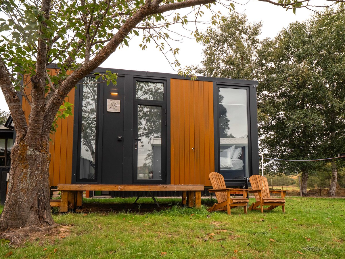From lush green trees and gentle, flowing creeks running through, Gold Nugget 3 sits idle with open arms to welcome you to a tiny house escape in Gold Park. This tiny house cabin is near the city of Dunedin and is a garden-like campground filled with hospitality, friendly Rudy the Red Deer, and numerous native birds waiting to enjoy together with you, your sweet escape for the weekend! #CozyTinyHome #HolidayHomesNZ