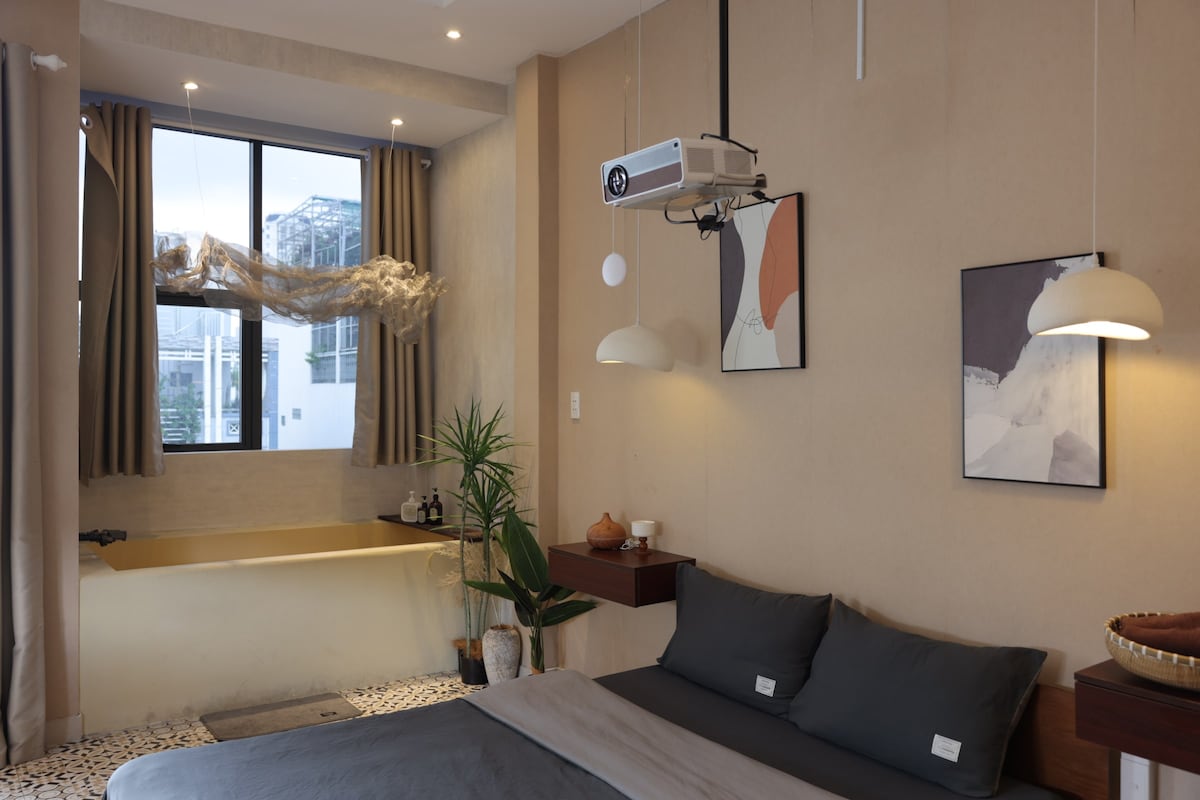 도심에 완벽하게 위치한 평화로운 휴양지인 와비 사비 룸을 만나보세요. 조용한 중산층 지역에 있지만 벤탄 시장에서 5분, 스타벅스에서 1분 거리에 있으며 근처에 길거리 음식이 풍부합니다. 안드로이드 TV와 프리미엄 넷플릭스가 있는 100인치 프로젝터를 즐겨보세요. 안전하고 개조된 개인 건물의 주요 도로에 위치하고 있으며, 번잡함에서 벗어난 100% 안전한 휴양지입니다.